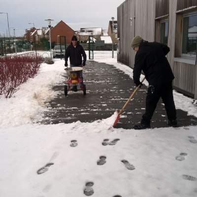 Mr Pheely and Mr Turner are hard at work clearing paths around school to ensure we can open safely on Tuesday.